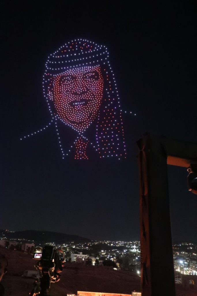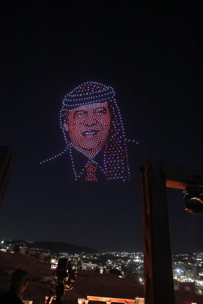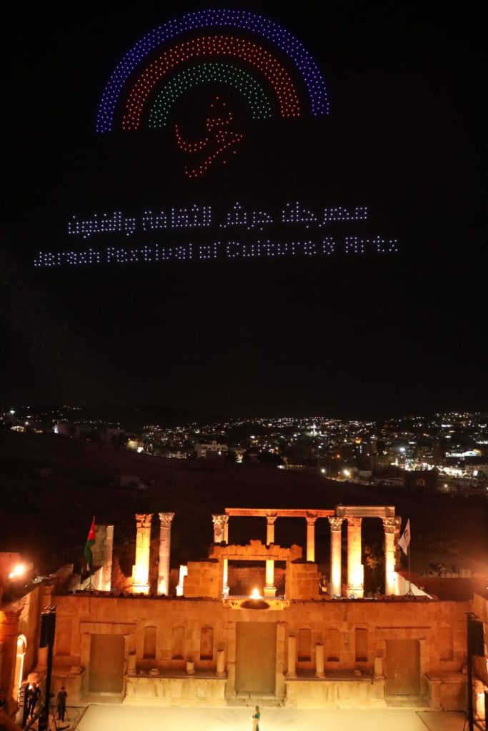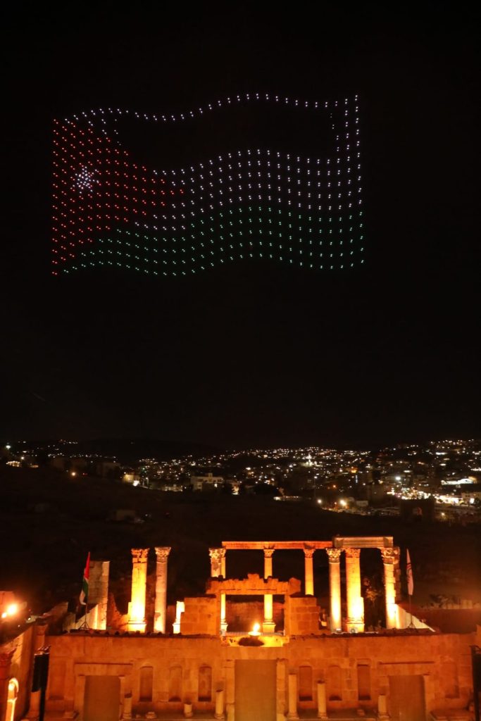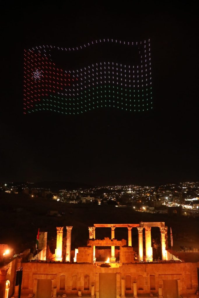 وشكلت طائرات الدرونز شعلة مهرجان جرش للثقافة والفنون، وصورة جلالة الملك عبدﷲ الثاني