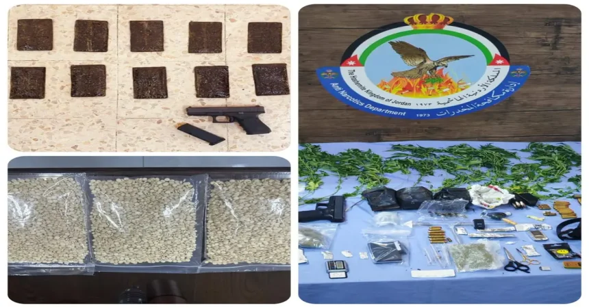 قال الناطق الإعلامي باسم مديرية الأمن العام إنّ العاملين في إدارة مكافحة المخدرات نفّذوا خلال الأسبوع الحالي حملات أمنيّة على تجّار ومروجين ومطلوبين بقضايا المخدرات في وسط وجنوب العاصمة، حيث أفضت الحملة الأولى وسط العاصمة ( جبل التاج ) عن إلقاء القبض على ثمانية أشخاص وضُبط بحوزتهم كمّيات متفرقة من المواد المخدرة، فيما أُلقي القبض في الحملة الثانية في مناطق جنوب العاصمة على تسعة أشخاص وضُبط ما بحوزتهم من مواد مخدرة وأسلحة نارية.وفي قضايا التهريب تعاملت الإدارة مع ثلاث قضايا، منها اثنتان في معبر جابر الحدودي، حيث تم بالتنسيق مع الجمارك الأردنية والأجهزة الأمنيّة هناك إلقاء القبض على شخص قادم للمملكة وبحوزته مجموعة من الصناديق، التي عُثر داخلها بعد تفتيشها على 20 ألف حبّة مخدرة كان ينوي إعادة تهريبها لإحدى دول الجوار مرة أخرى .وفي القضية الثانية أُلقي القبض على شخصين تورطا بمحاولة تهريب 15 ألف حبّة مخدرة إلى المملكة بعد أنْ جرى تفتيش إحدى المركبات القادمة عبر حدود جابر ليُعثر على المواد المخدرة في مخبأ سرّي في أحد أجزاء المركبة .وفي قضية التهريب الثالثة أُلقي القبض في العاصمة على ثلاثة أشخاص بعد تتبعهم والتأكد من قيامهم بتجهيز كمية من المواد المخدرة تمهيداً لتهريبها لإحدى دول الجوار، حيث جرى تحديد المركبة والتي عثر داخلها بعد تفتيشها على 7 آلاف حبة مخدرة .وفي قضايا الاتجار والتهريب أُلقي القبض في محافظة العقبة على تاجر للمخدرات بعد مقاومته للقوة وضبط بحوزته 10 كفوف حشيش وسلاح ناري ، فيما أُلقي القبض شرق العاصمة على مروجين اثنين وبحوزتهما 6 كفوف حشيش ، ومروج آخر أيضا شرق العاصمة وبحوزته 4 كفوف حشيش.
