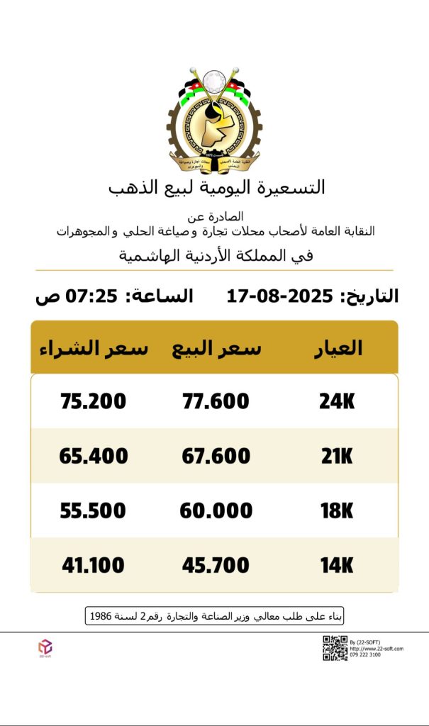 من الذهب عيارات 24 و18 و14 لغايات البيع من محلات الصاغة عند 77.6 و60 و45.7 دينارا على
