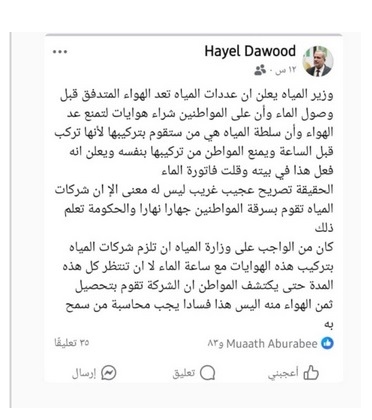 وقال داود في منشور له على صفحته على فيسبوك،” الحقيقة ان تصريح عجيب غريب ليس له معنى إلا ان شركات المياه تقوم بسرقة المواطنين جهارا نهارا والحكومة تعلم ذلك” .